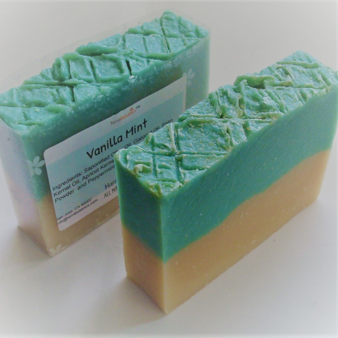 Contains: Saponified coconut oil, olive oil, palm-kernel oil, apricot kernel oil, cocoa butter, peppermint essential oil, and vanilla oil.