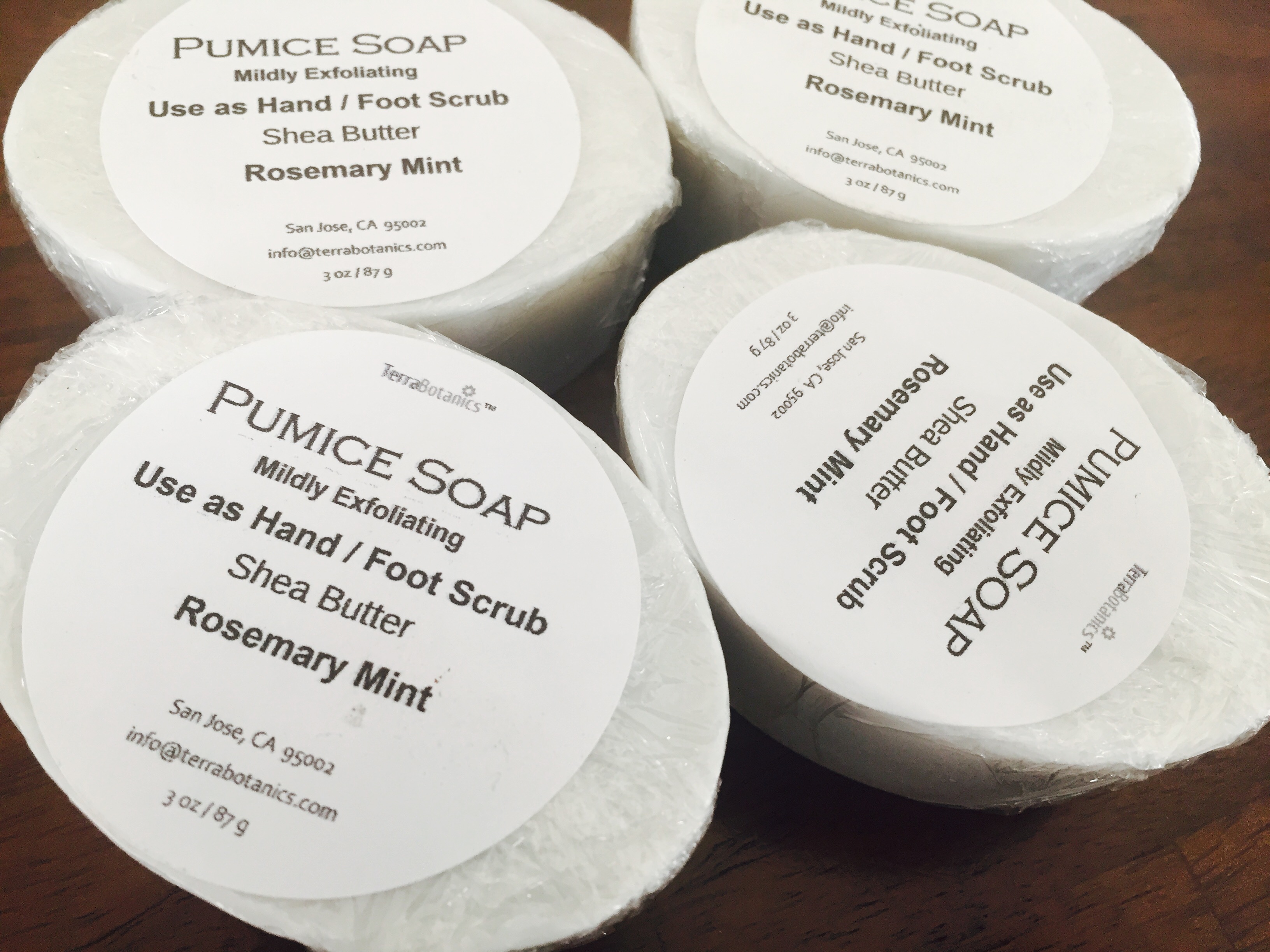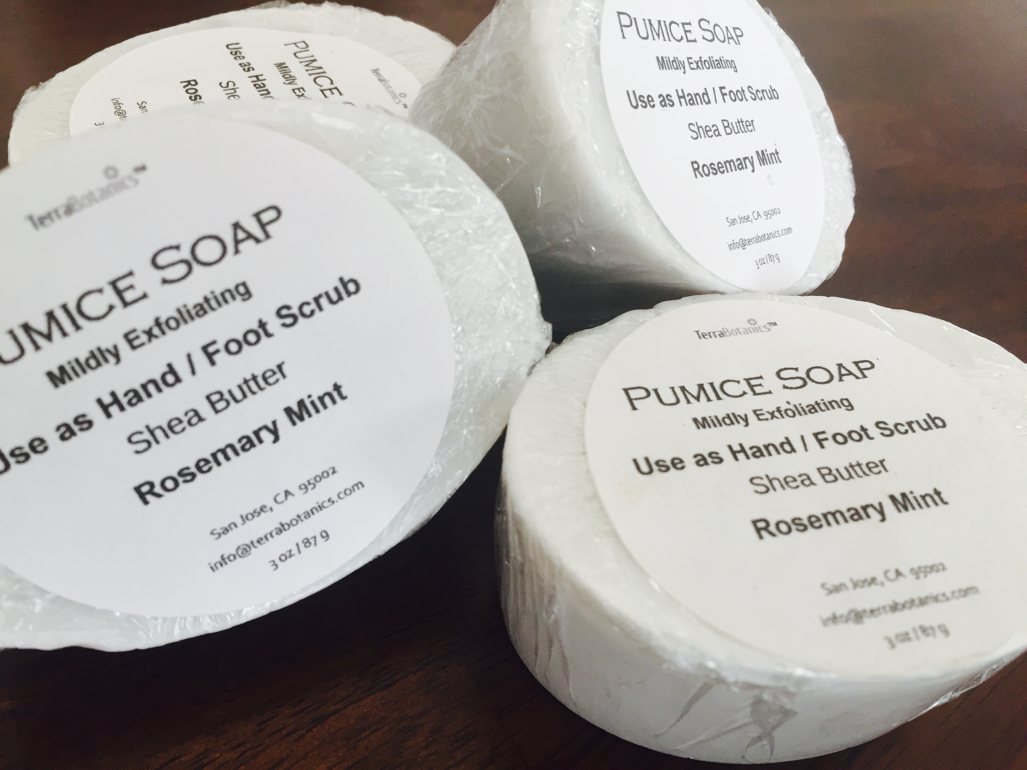 Pumice is a natural exfoliant which is made up of volcanic ash. The fine pumice powder in the soap makes an effective scrubby bar. Use it on feet to smooth and moisturize. Scented with rosemary and peppermint oils.